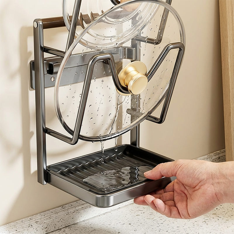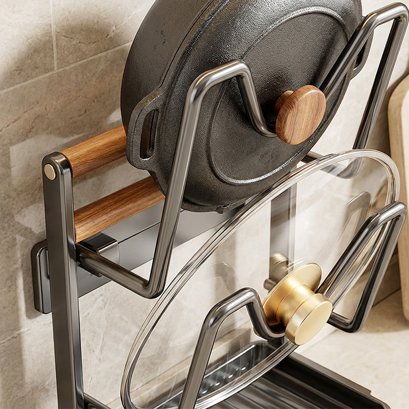 UNIVERZÁLIS KOMPATIBILITÁS: A gondosan megtervezett U alakú nyílások biztonságosan befogadják a különféle edényfedőket, serpenyőket és vágódeszkákat, így igazán sokoldalú, all-in-one tárolási megoldást kínálnak.